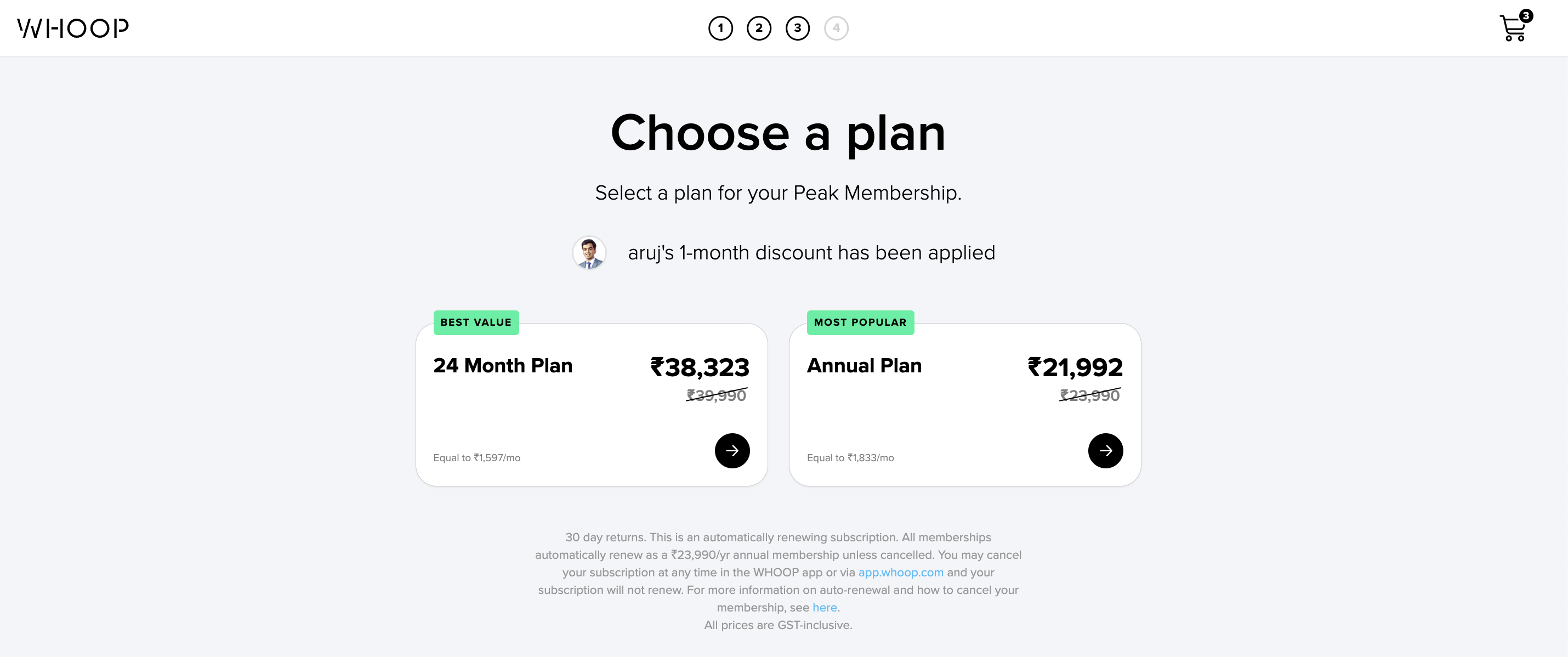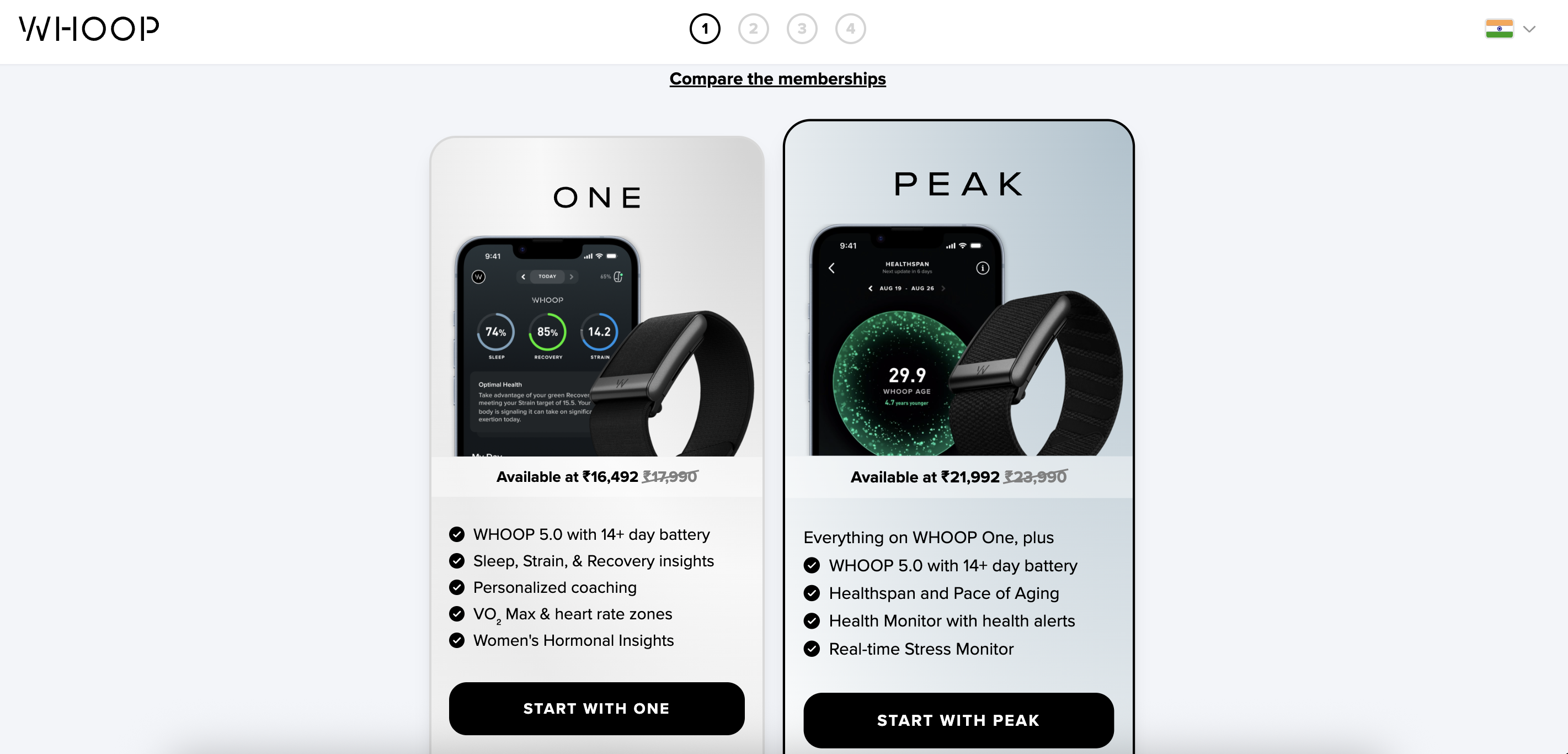 Scroll down and you’ll see the section to “Choose a membership.” With the launch of the 5.0, WHOOP has introduced three different plans: One, Peak, and Life. The Life plan features are not approved in India, so you will only see the One and Peak plans available to choose from.