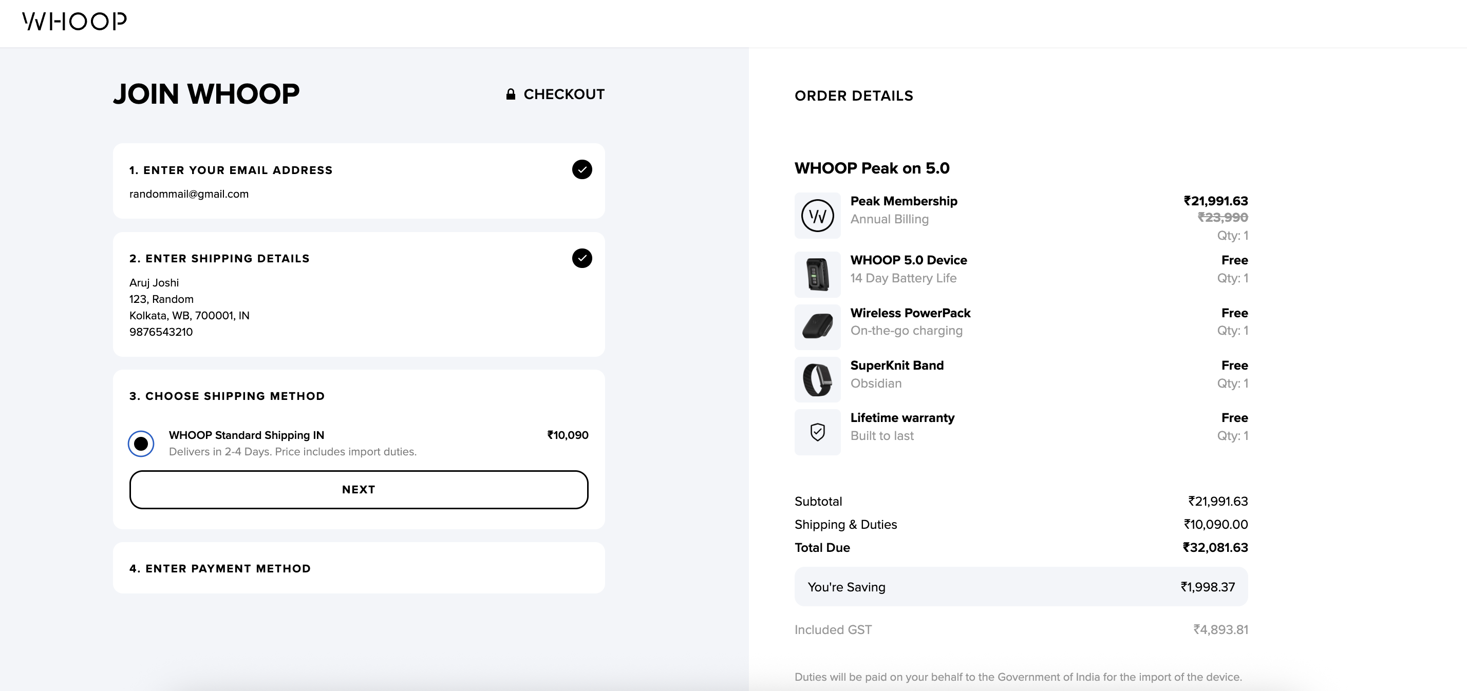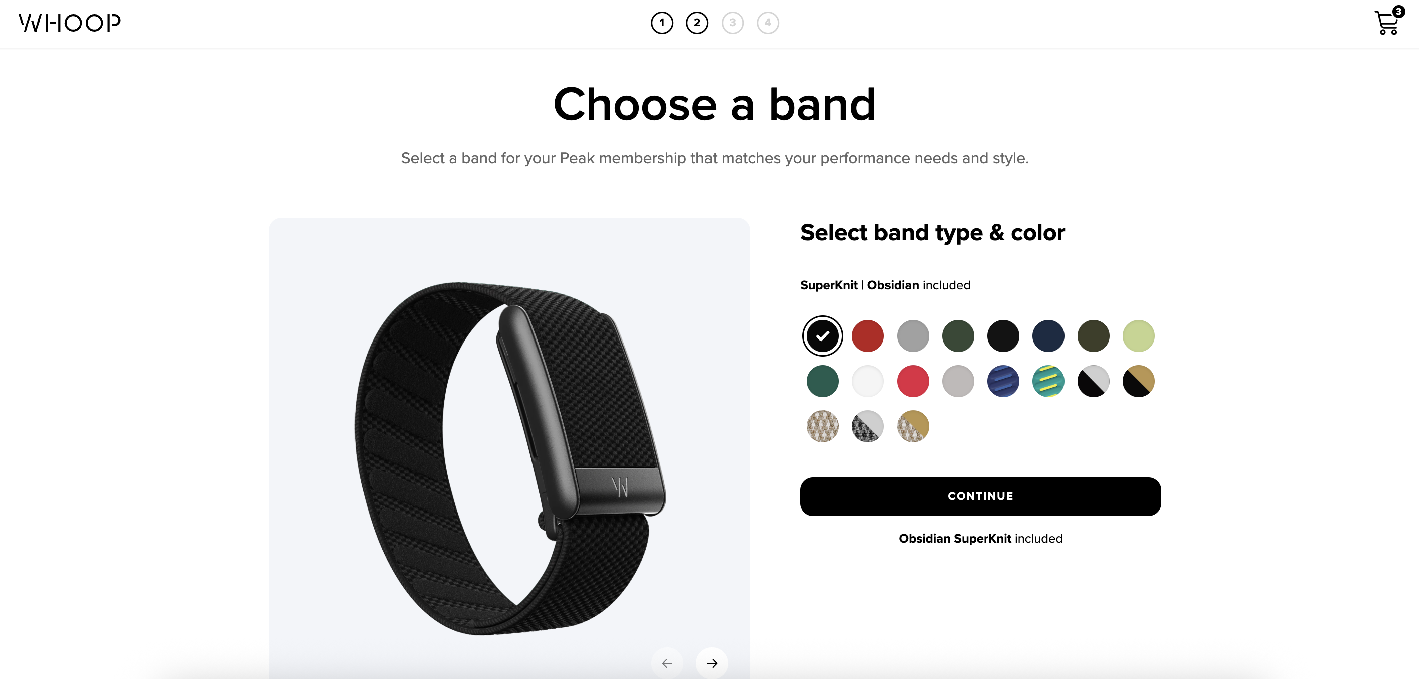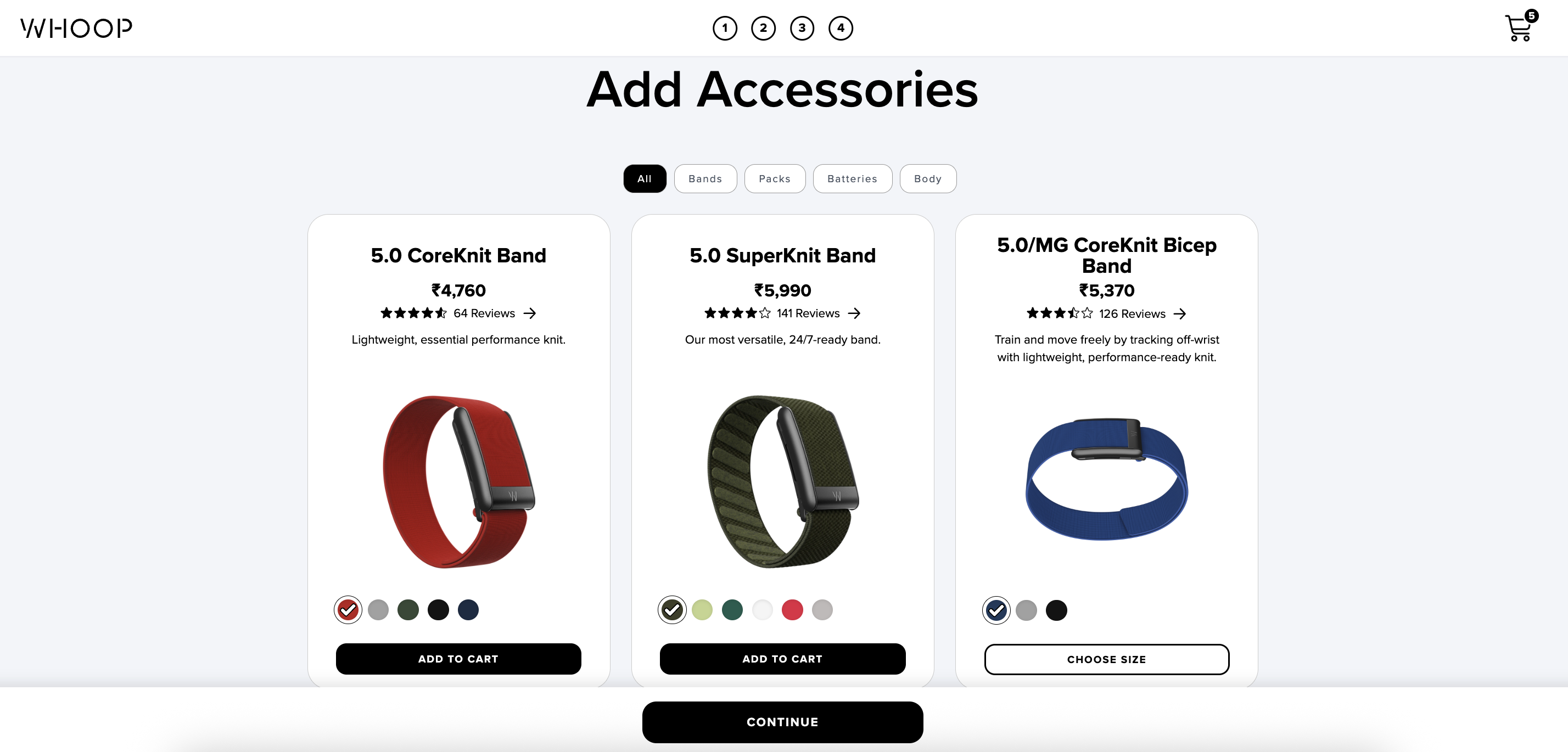 After landing on this page, select your band. The SuperKnit Obsidian band is included and comes with Whoop at no extra cost. However, if you prefer a different colour, you can choose from the available options, which range between ₹5,000 – ₹15,000 per band. Once you’ve selected your band, click Continue.