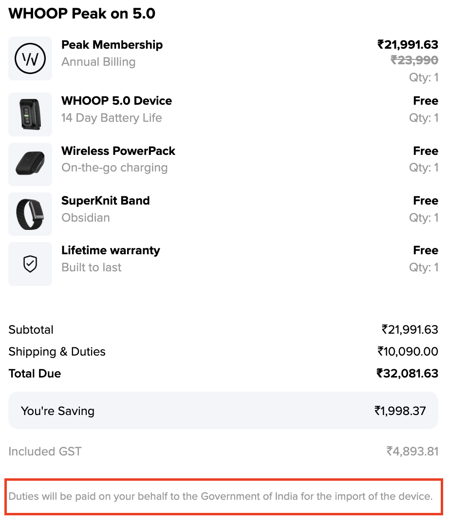 At the end of the checkout, you’ll notice a note stating that duties will be paid on your behalf to the government of India for the import of the device. This means all customs duties and import charges are already included in the final price, so you don’t have to pay anything extra.
